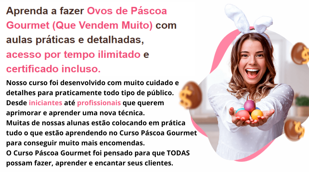 A Páscoa é a melhor época de vendas, e me ajudou muito a conquistar minha independência financeira e dar uma qualidade de vida melhor aos meus filhos. Eu quero que você acredite que pode ter sua renda extra e ter independência financeira também, mesmo com todas as adversidades.